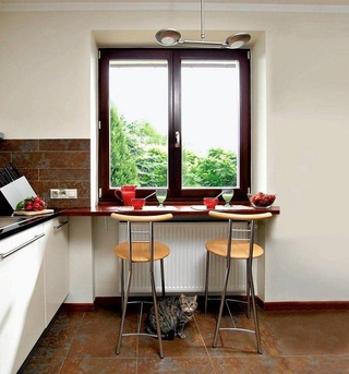 Столешница. Ее можно сконструировать самостоятельно и разместить, например, у окна, где она практически не будет занимать пространство. Это место обычно не загораживается бытовой техникой, и столешница ничем не помешает.
