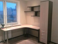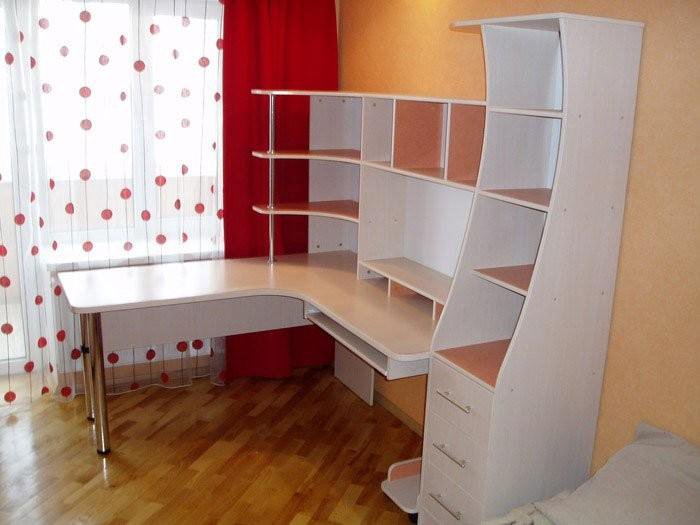 - письменная и рабочая столешница с полочками вдоль окна в комнате для двух детей