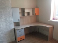Стиль представляет собой пример модного в наши дни эко-стиля. Мебель сделана из ДСП. Цвета мебели- сочетание жизнерадостного оранжевого и умиротворяющего молочного дуба. Никакого пластика и острых углов, такой стол не будет представлять угрозы ни для экологии, ни для ребенка.