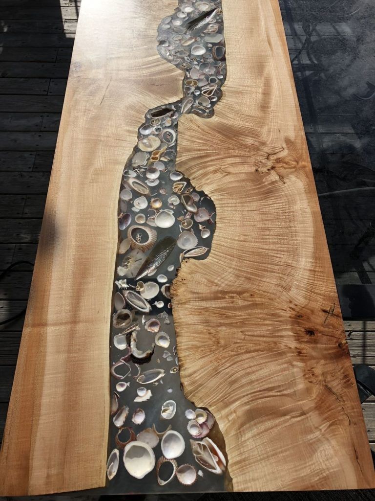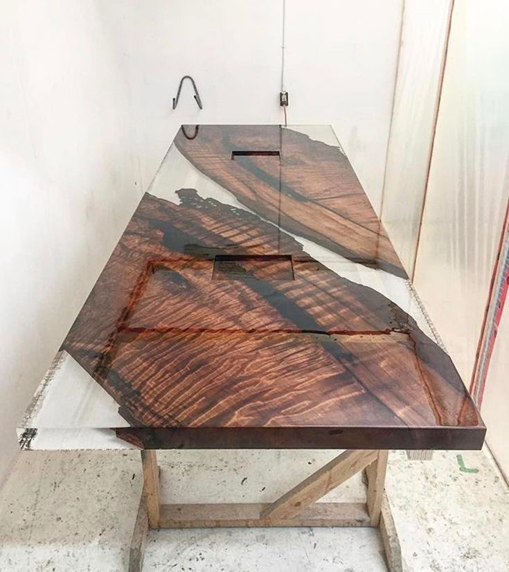 Кому-то больше всего нравится заливка слэба эпоксидной смолой. Она дает больше свободы для творчества, да к тому же она позволяет работать с любым деревом, в том числе с поврежденным, рассохшимся, растрескавшимся и даже местами рассыпавшимся от старости и порчи. Немного усилий и разбитая в хлам древесина превращается в дизайнерский шедевр.