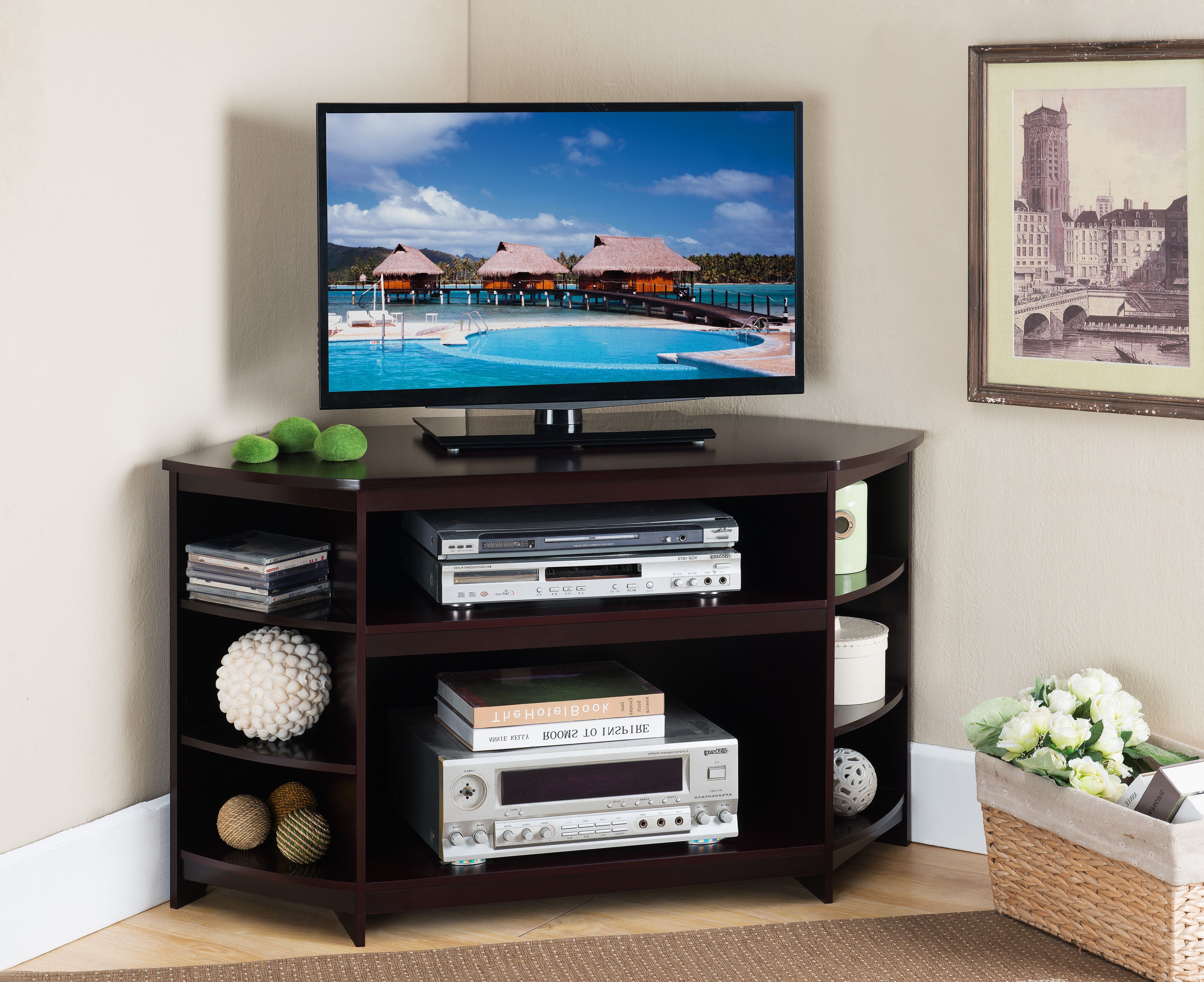Угловая тумба под телевизор: симпатичная и компактная, эта угловая тумба для телевизора — фантастическая идея для помещений с ограниченным пространством. Он даже имеет несколько полок и дверцы с жалюзи для дополнительного увеличения места для хранения. Также доступен в черном цвете.