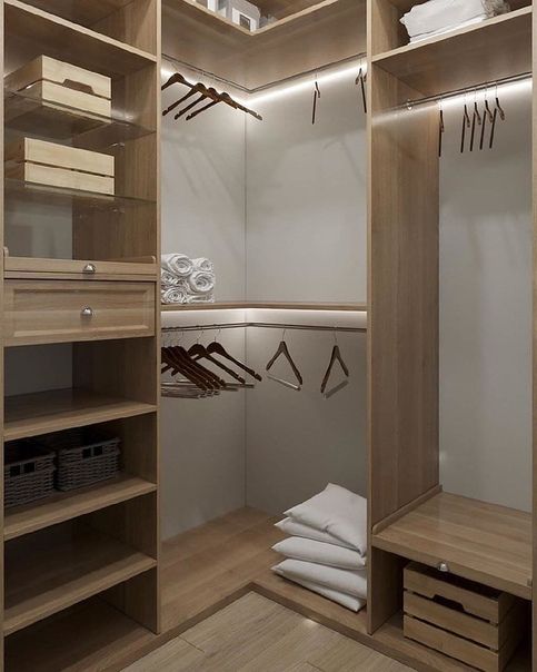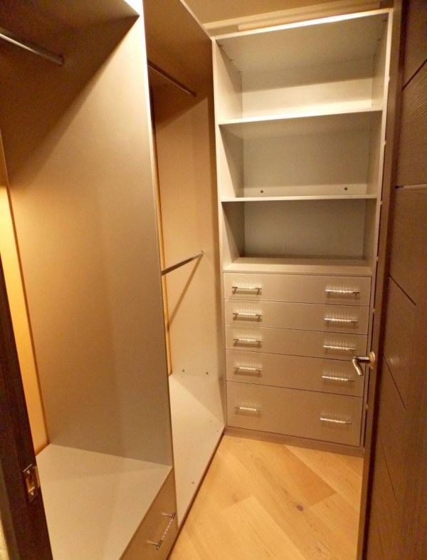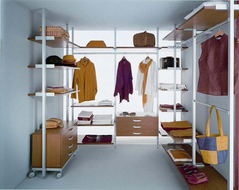 Проще всего размешать мебель по периметру стен кладовой. Стену с дверным проемом можно оставить свободной. Для комнаты детских вещей или гардеробной также подойдет г-образное размещение. В этом случае по периметру комнаты устанавливаются места для хранения, имитирующее вместительный шкаф.