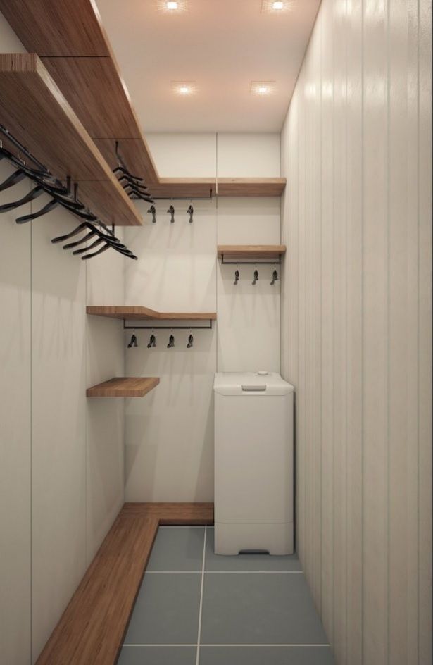 Чаще всего стиральную машину устанавливают на кухне или в ванной комнате. Однако если площадь мокрых зон ограничена, а кладовая расположена рядом с кухней – вы можете разместить в ней отдельную прачечную. В небольшом пространстве поместиться стиральная машина, сушилка, доска для глажки, утюг и все дополнительные предметы.