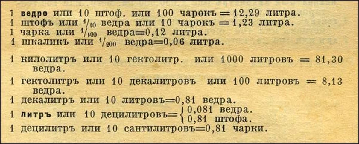 В основе используемых в народе измерений объема жидкости было ведро. В письменных памятниках X-XIII вв. термин «ведро» упоминается в двух значениях: во-первых, как хозяйственный сосуд, и, во-вторых, как единица объема. В значении «сосуд, определенно установленного объема» слово ведро употреблен не изолированно, а с дополнительным определением, например, ведро государево, ведро дворцовое и ведро казенное. Причем образцом для измерения объема жидких веществ было ведро дворцовое. Первоначально оно делилось на двенадцать кружек, каждая из которых содержала в себе почти три фунта чистой воды.
