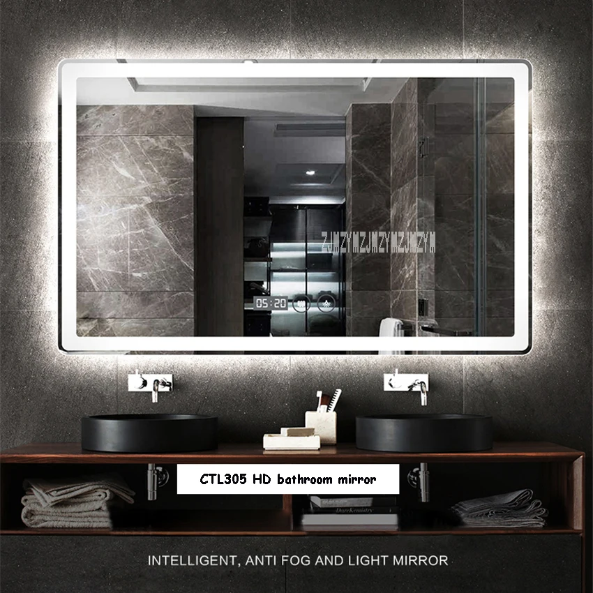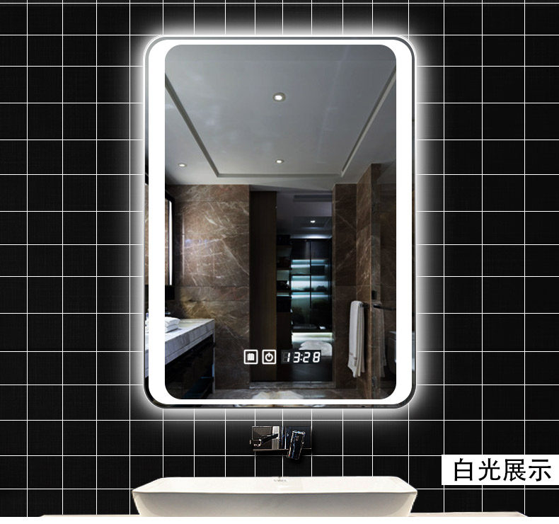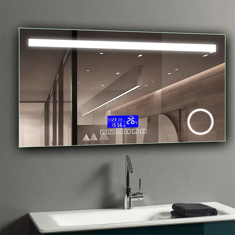 Сенсорные часы обладают более широким функционалом: на ЖК-дисплее, встроенном в зеркало, отображается время, дата, день недели и температура воздуха в помещении, а сенсорная панель управления под экраном позволяет не только настраивать данный модуль, но и управлять подсветкой зеркала.