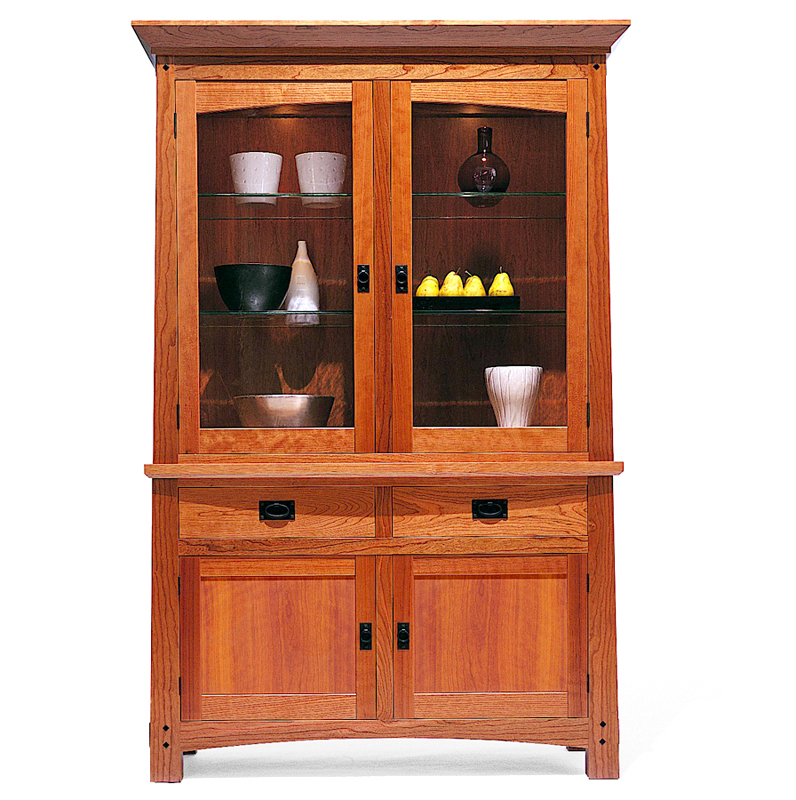 Состоит из двух частей, которые имеют обязательное трехстороннее остекление. Благодаря этому в горке удается поместить большое количество дорогой или же коллекционной посуды. Высота такого шкафа небольшая, что также является одной из положительных особенностей горки. Здесь также предусмотрена закрытая часть, где хранят столовые приборы и другие мелочи.