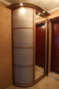 По этой же причине радиусный шкаф не украшают витражами. - Встроенный радиусный шкаф нельзя переставить в другое место. Но если прямой встроенный шкаф универсален, и его можно монтировать в любом другом месте, то радиусные модели за счет специфики формы впишутся в габариты далеко не в любое пространство прихожей.