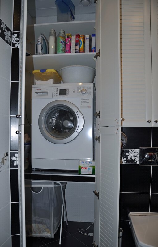 Эта стиральная машина спрятана в шкафу. Вместо шкафа можно использовать тумбу или шкаф-пенал с полками для стиральных средств.