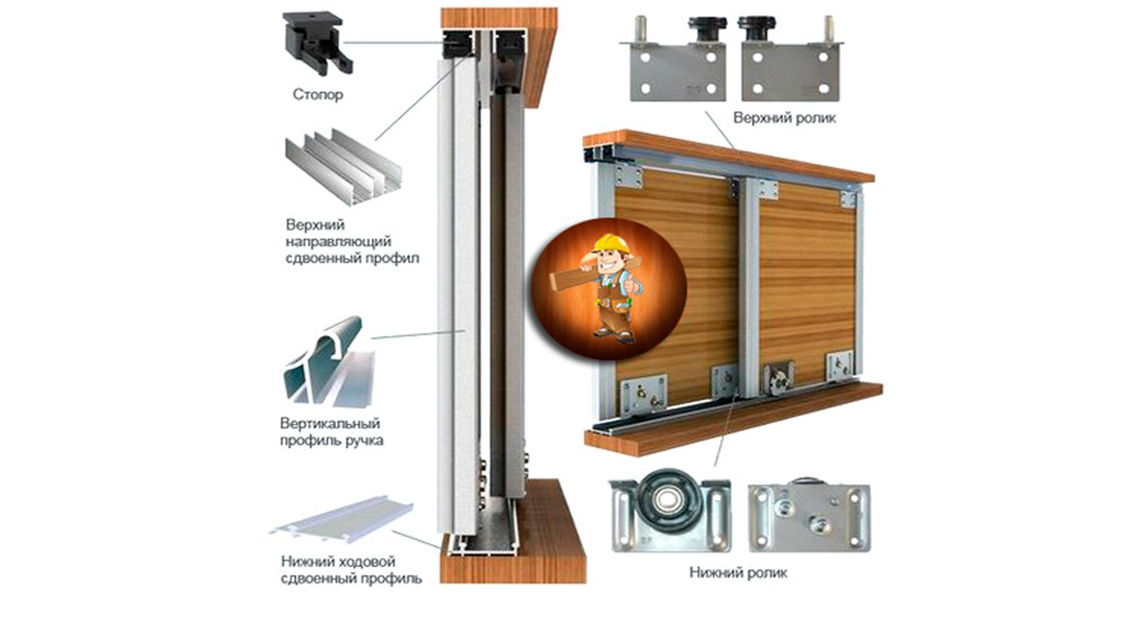 - Стопоры и ограничители. С их помощью дверная конструкция плавно перемещается по направляющему профилю и фиксируется в заданной точке.