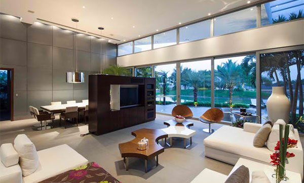 Эта современная гостиная отличается чистыми линиями и обширными деталями даже для стеновой части.