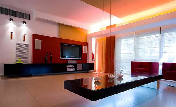 Оригинально в данном случае будет смотреться телевизор установленный в открытое пространство, особенно при наличии подсветки и зеркальной отделке.