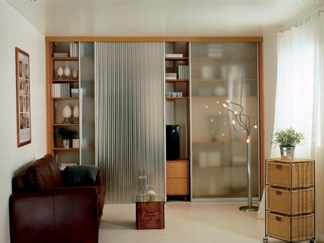 Не менее интересен и функционален шкаф-купе в гостиной во всю стену. За их раздвижкой можно скрыть платяной отдел, а также полки и ящики для всевозможных вещей.