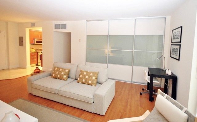 .Ремонт в гостиной новостройки, встроенный шкаф и закрытый тканевый вход в комнату Фото