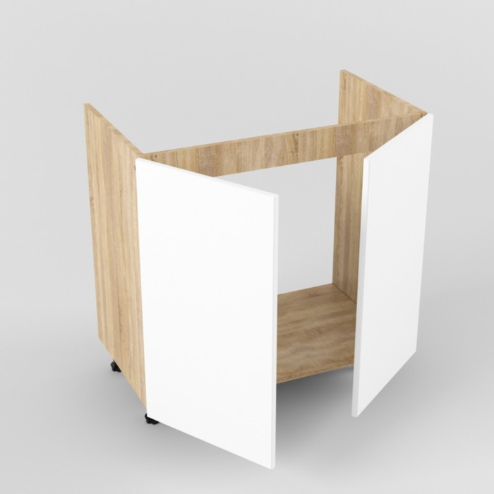 Если модель кухни идет без единой столешницы, высота таких шкафов, а вернее каркасов шкафов будет одинаковой. Однако, если отдельные шкафы идут со столешницами, то высота шкафа под накладную мойку, будет на 10 мм ниже высот каркасов остальных шкафов. Это нужно учесть, если захотите отдельные столешницы шкафов, заменить на общую рабочую поверхность.