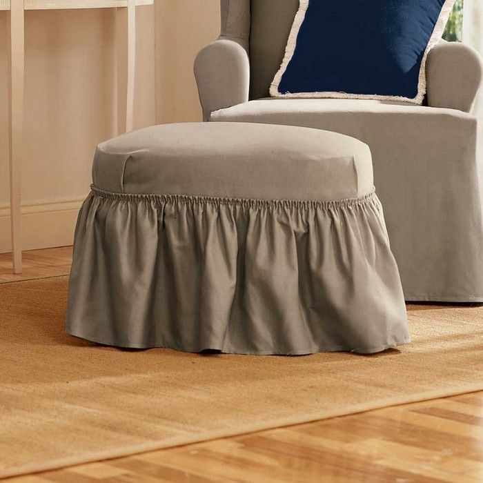 Такой чехол с оборкой подходит для пуфов с короткими ножками, которые могут быть закрыты оборкой или наоборот. Изготовления выкройки из муслина в данном случае не требуется, поскольку все детали – прямоугольные и их можно выкроить по меркам, снятым с пуфа. Специальные потайные завязки помогут удержать чехол на месте. Саржевые ленты, пришитые к чехлу с изнанки, завязываются вокруг ножек, не давал чехлу смещаться. Оборка посажена на подкладку которая придает больший объем и позволяет скрыть подогнутый нижний край.