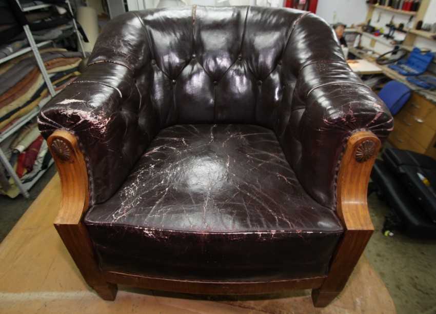Она должна быть достаточно прочной и плотной, легко очищаться и держать форму. Хорошо если обивка также будет пропитана водоотталкивающими составами. Если ткань соответствует всем или хотя бы большинству описанных свойств, можно переходить к следующему этапу выбора – расцветки, фактуры, рисунка и т.п. Стоит отметить, что для перетяжки кресла с подлокотниками одновременно можно использовать несколько разных тканей. Итак, обивку мебели чаще всего осуществляют кожей, нубуком, гобеленом, флоком, шениллом и жаккардом (см. фото).