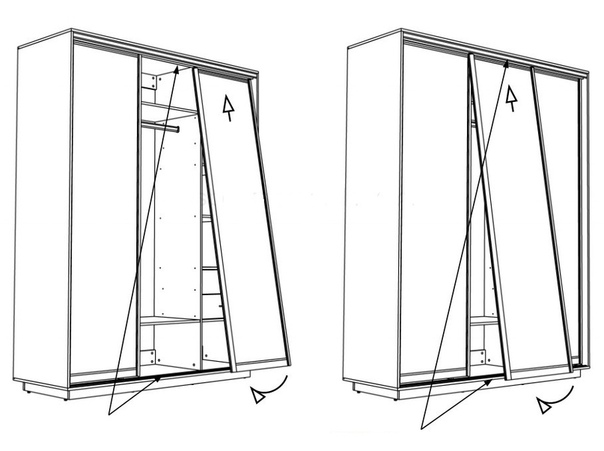При необходимости снять дверь шкафа купе так же просто как поставить — надо поднять ее вверх до упора и вынести ее нижнюю часть «к себе». Иногда так же потребуется вдавить ролики в нижний горизонтальный профиль.