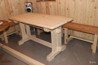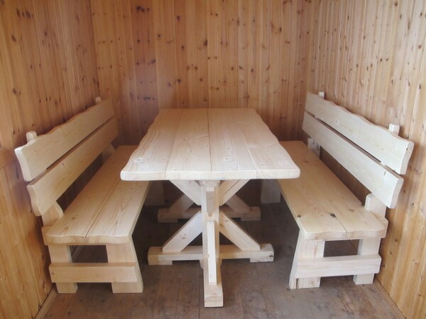 Еще один подходящий для бани вариант — конструкция из стола и скамеек.
