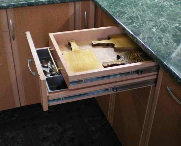 Поэтому в готовую мебель, которая уже активно эксплуатируется, все-таки лучше встраивать выдвижные ящики отдельным модулем.