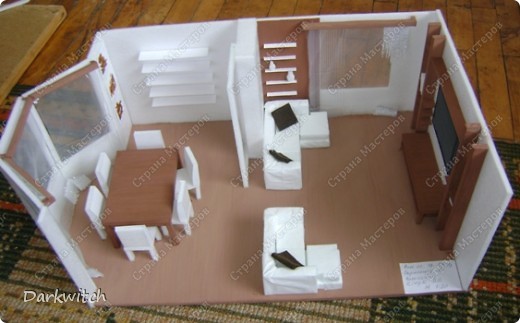Это довольно просто, поскольку бумага очень пластичный материал. Предметы мебели раскраиваются на бумаге, склеиваются и помещаются внутрь модели здания. Если площадь модели дома не велика, целесообразно выставлять предметы интерьера на фоне стен модели.