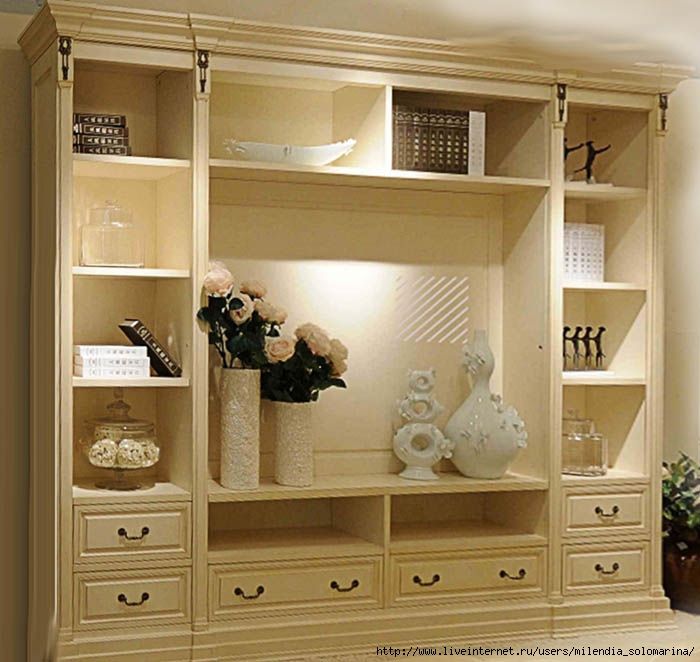 Во-первых, стенку можно осветлить (трендовый минимализм приветствует светлые тона) и использовать в кабинете или библиотеке. Многочисленные полочки, секретеры идеально подойдут для хранения ценных документов и корпоративных сувениров.