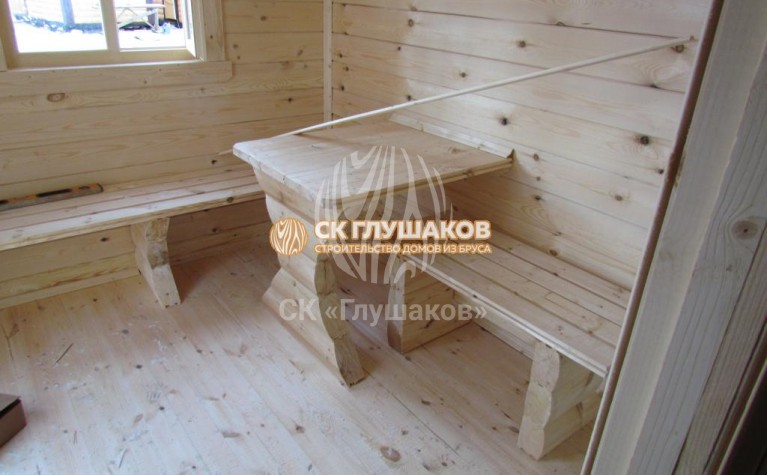 Хоть стол небольшой, для масштабных застолий не подходит, но можно поставить кувшин с водой, стаканы, известно ведь, сколь важно в бане восполнение потерянной влаги.