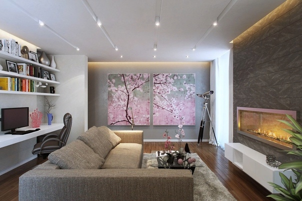 Диванная зона может граничить с рабочим местом, а зона отдыха со столовой, где вы можете отдыхать и встречать гостей. Зонирование также производят и с помощью разноуровневых полов.