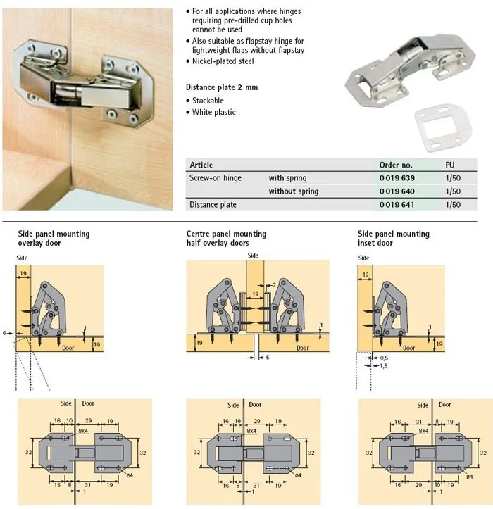 Чашки меньшего диаметра (26,0 миллиметров) имеют модели, предназначенные для установки на небольшие по массе и размерам дверные створки, а также на распашные дверки из стекла, как например, в сервантах. Плечо-рычаг является корпусом регулировочного механизма и соединяется с установочной площадкой, закрепленной внутри мебельного отсека, на его боковине. Крепление всех элементов петельной фурнитуры осуществляется шурупами-саморезами или с использованием винтового конфирмата.